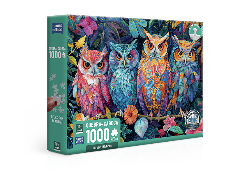Quebra-cabeça de 1000 peças das fantásticas Corujas Místicas, cheio de cores e detalhes! Este quebra-cabeça vem com padrão internacional de qualidade e encaixe suave que pode ser sentido em cada peça!