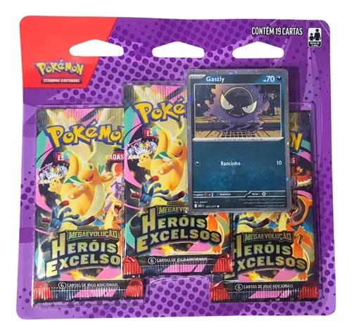 CONTEÚDO DA COLEÇÃO: Inclui uma carta laminada promocional de Gastly, além de três pacotes de booster da expansão especial Megaevolução — Heróis Excelsos para expandir sua coleção